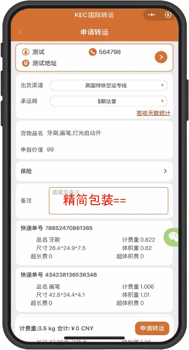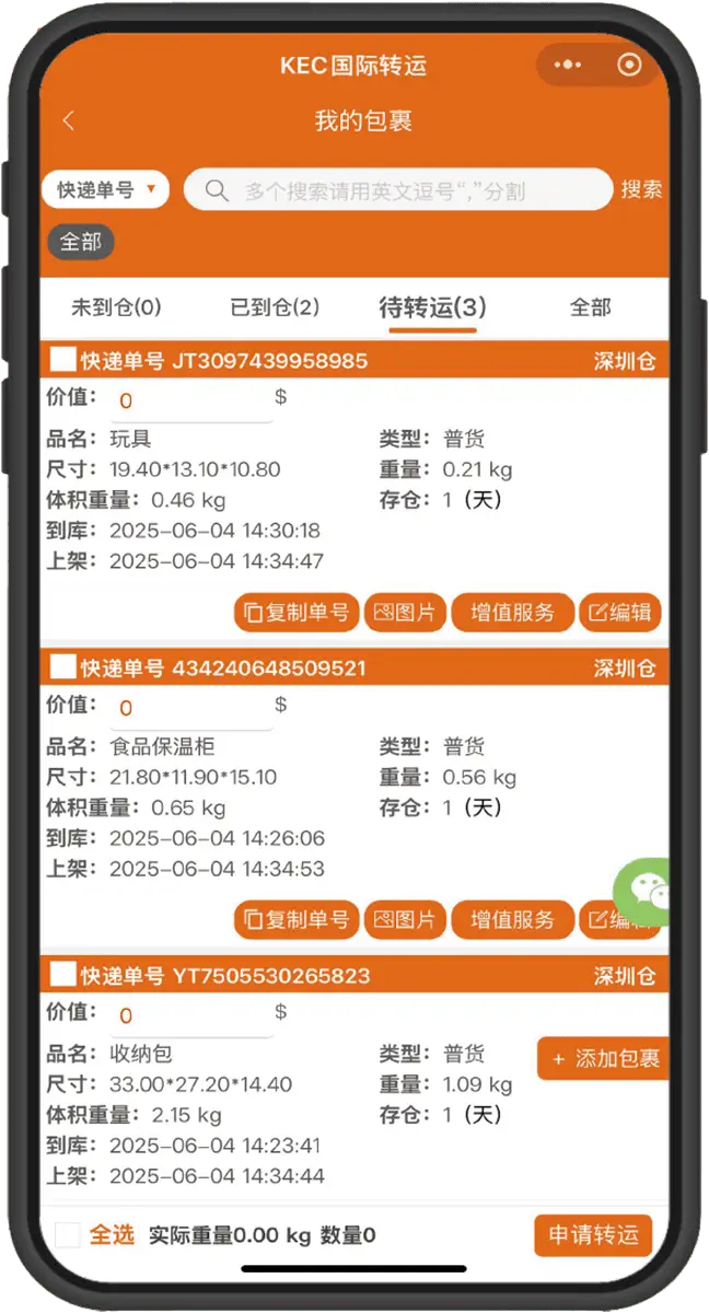在「我的包裹」頁面勾選到庫包裹,點擊「申請轉運」,填寫申報信息並提交。